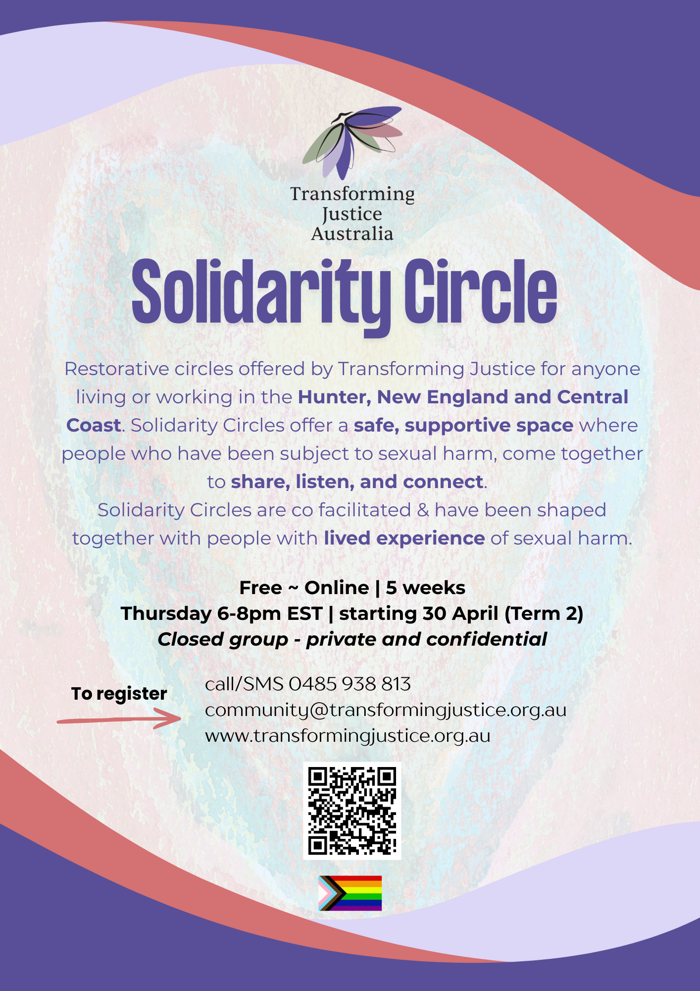 Click here to register your interest or get in touch with Mardi mardi@transformingjustice.org.au or Melissa melissa@transformingjustice.org.au